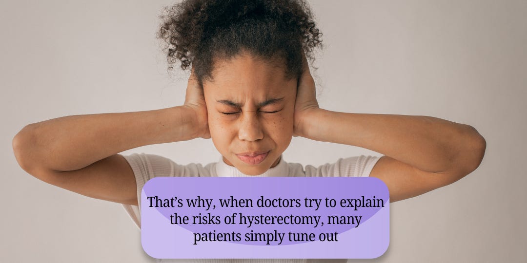 — That’s why, when doctors try to explain the risks of hysterectomy, many patients simply tune out. Unwittingly, they agree to surgery, believing the risks are zero.